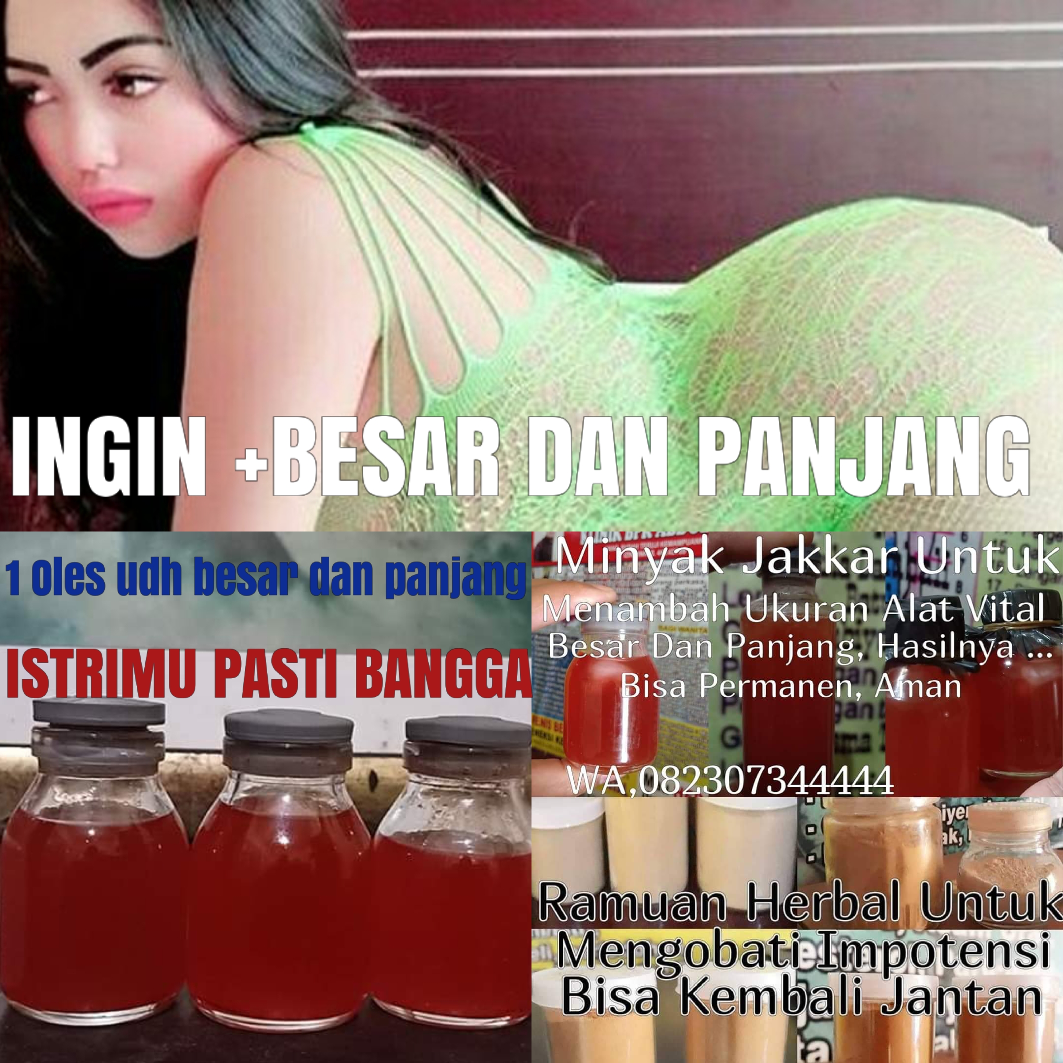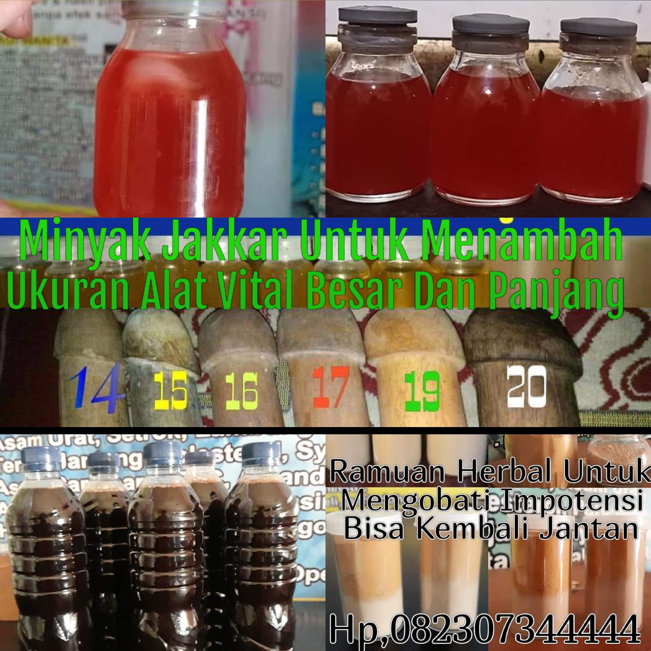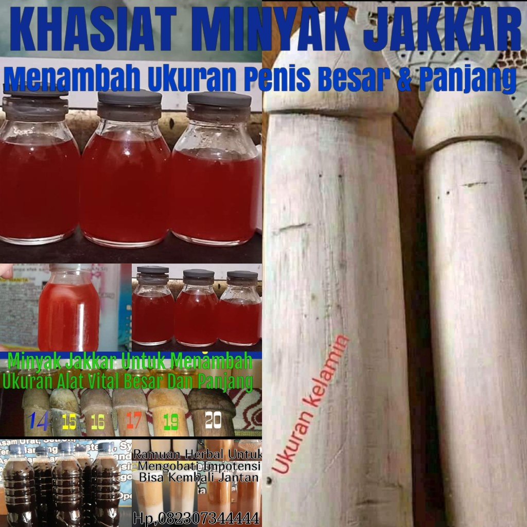 Panjang 15cm, Besar Diameter 3 cm Panjang 16cm, Besar Diameter 4 cm Panjang 18cm, Besar Diameter 5 cm Panjang 20cm, Besar Diameter 6 cm Bisa Menjadikan besar dan Panjang Bisa Keras dan Tahan lama Ingat! No.suntik slikon dan Bahan berbahaya Selain itu kami menawarkan jalan keluar untuk anda yang memiliki masalah kurang percaya diri sehingga tidak bisa memberikan yang terbaik dalam berhubungan bersama pasangan anda. Semua akan diatasi melalui pengobatan alat vital dengan menggunakan teknik pengobatan yang sangat Mujarab Ramuan Herbal, Dan Minyak Jakkar 100% aman tanpa menimbulkan efek samping.