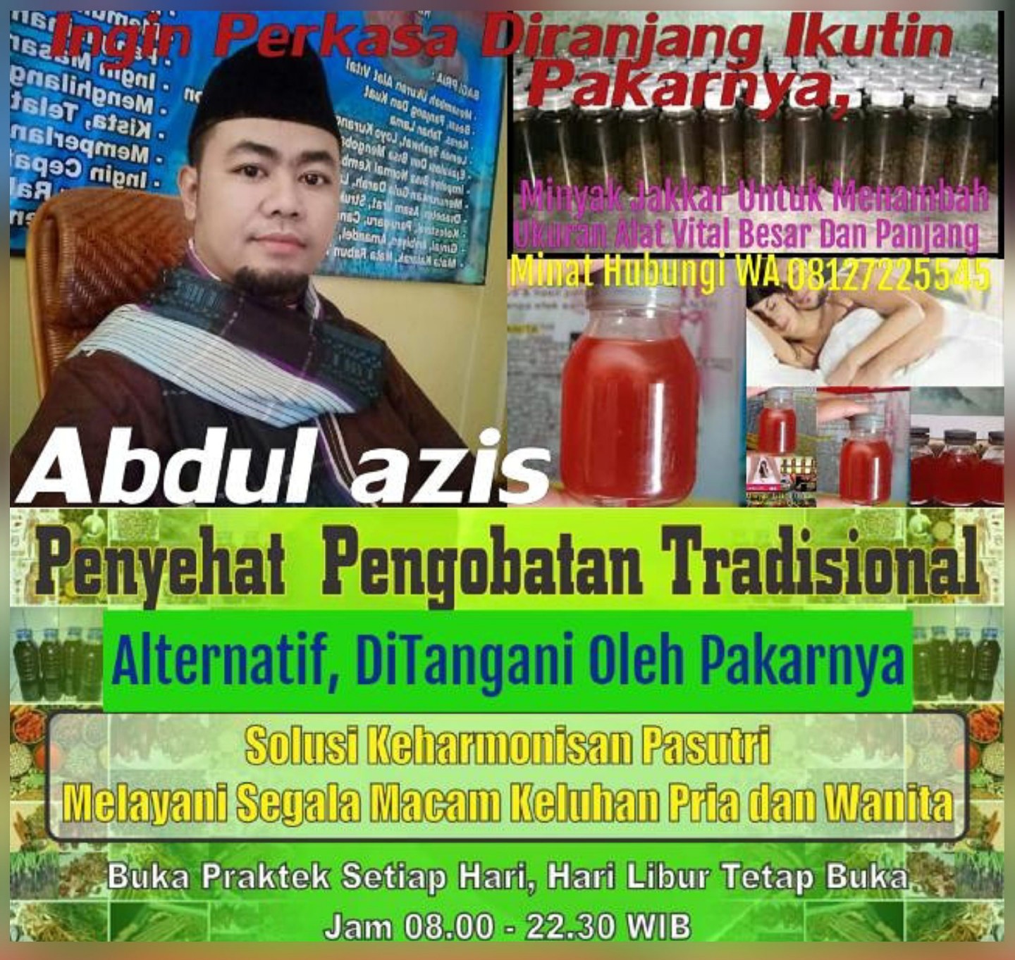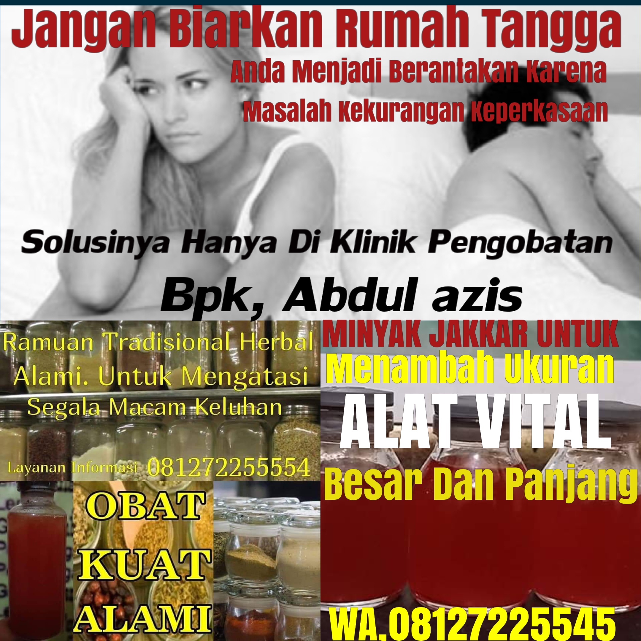 KABAR GEMBIRA SOLUSI KEHARMONISAN PASUTRI. KLINIK PENGOBATAN TRADISIONAL ALTRNATIF. Ditangani Langsung Oleh, PAKARNYA. BPK. ABDUL AZIS. SEBAGAI AHLI TERAPIS ALAT VITAL. MELAYANI BERBAHGAI MACAM KELUHAN PRIA & WANITA. Bagi Yang Kurang Percaya Diri Dengan Seputar Alat Vital Anda Karena Kecil, Jangan Hawatir Solusinya Hanya Di Klinik Pengobatan Keperkasaan Dan Anda Dapat Dikagumi Pasangan Untuk Lebih Detail Nya,,?