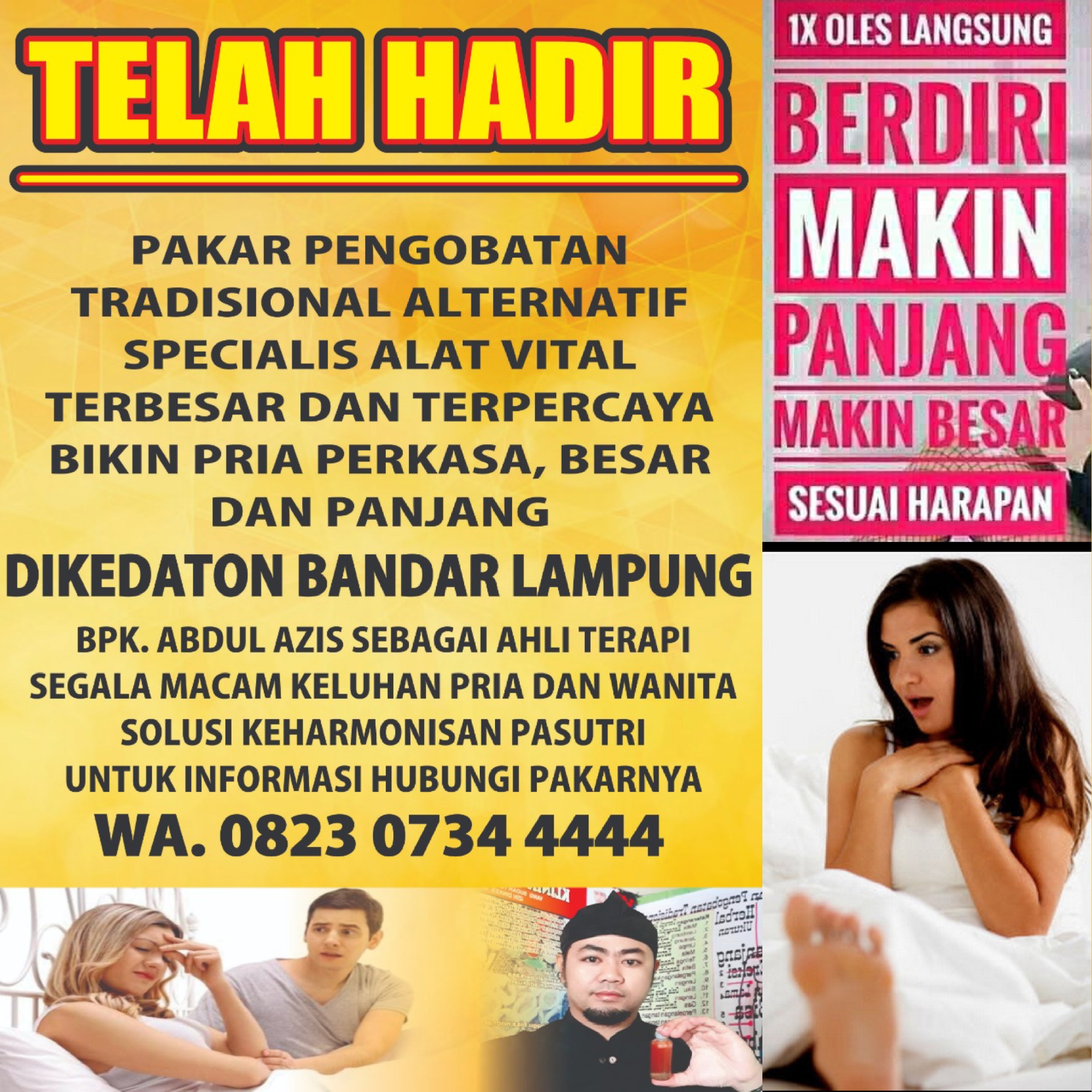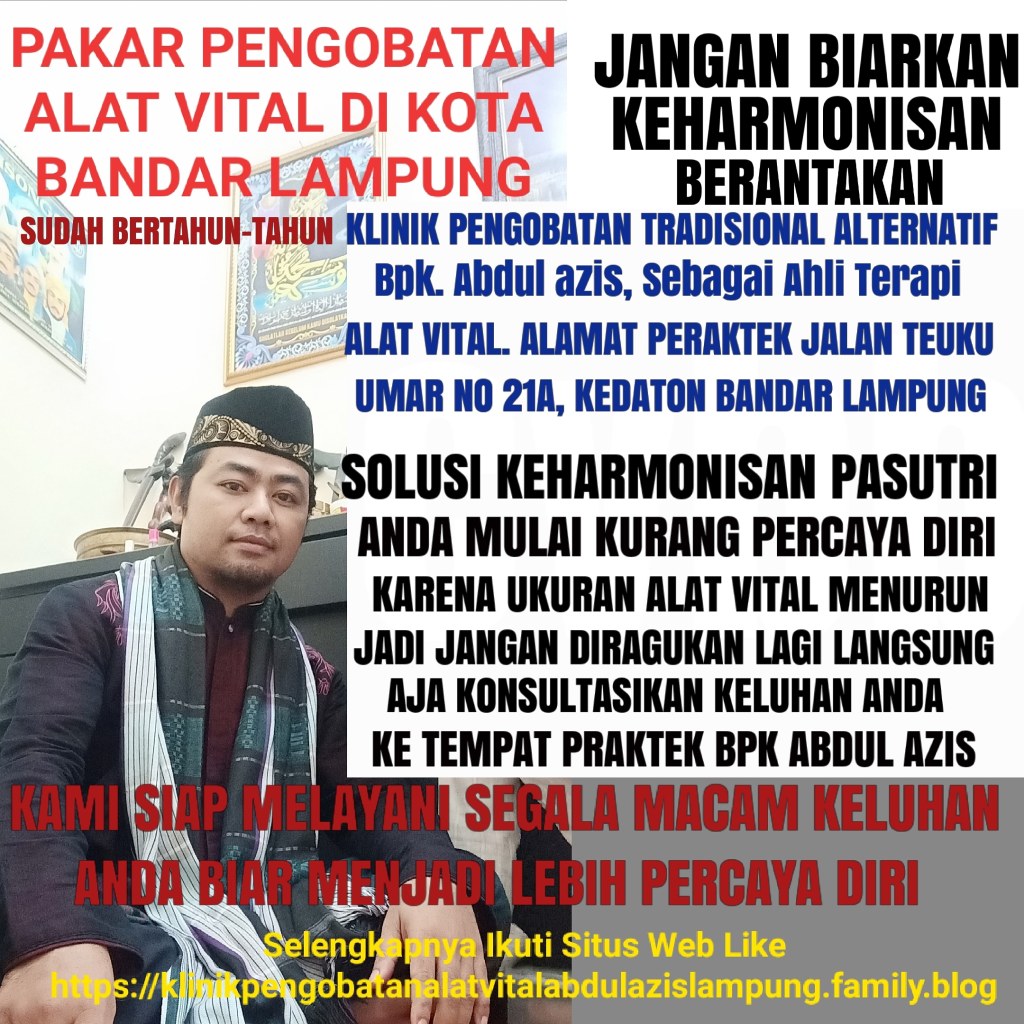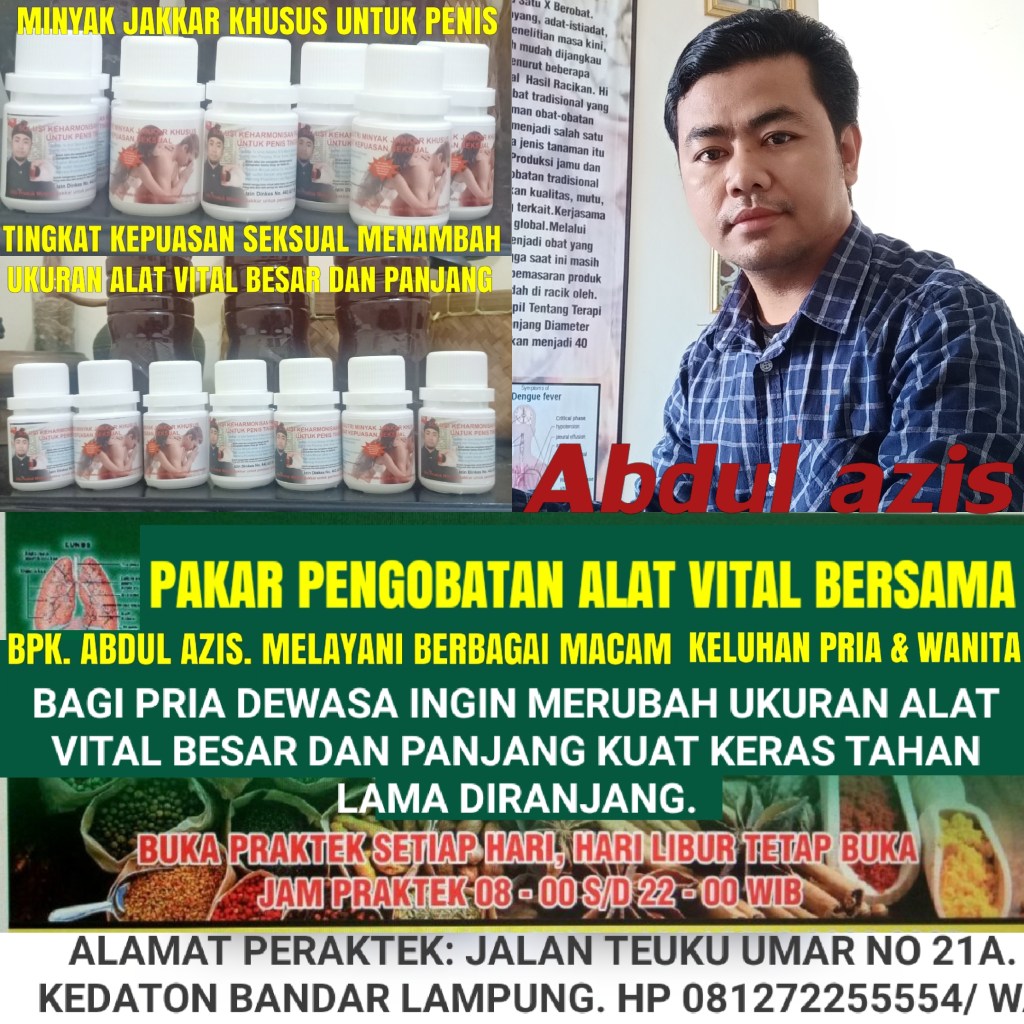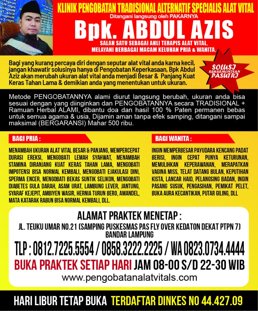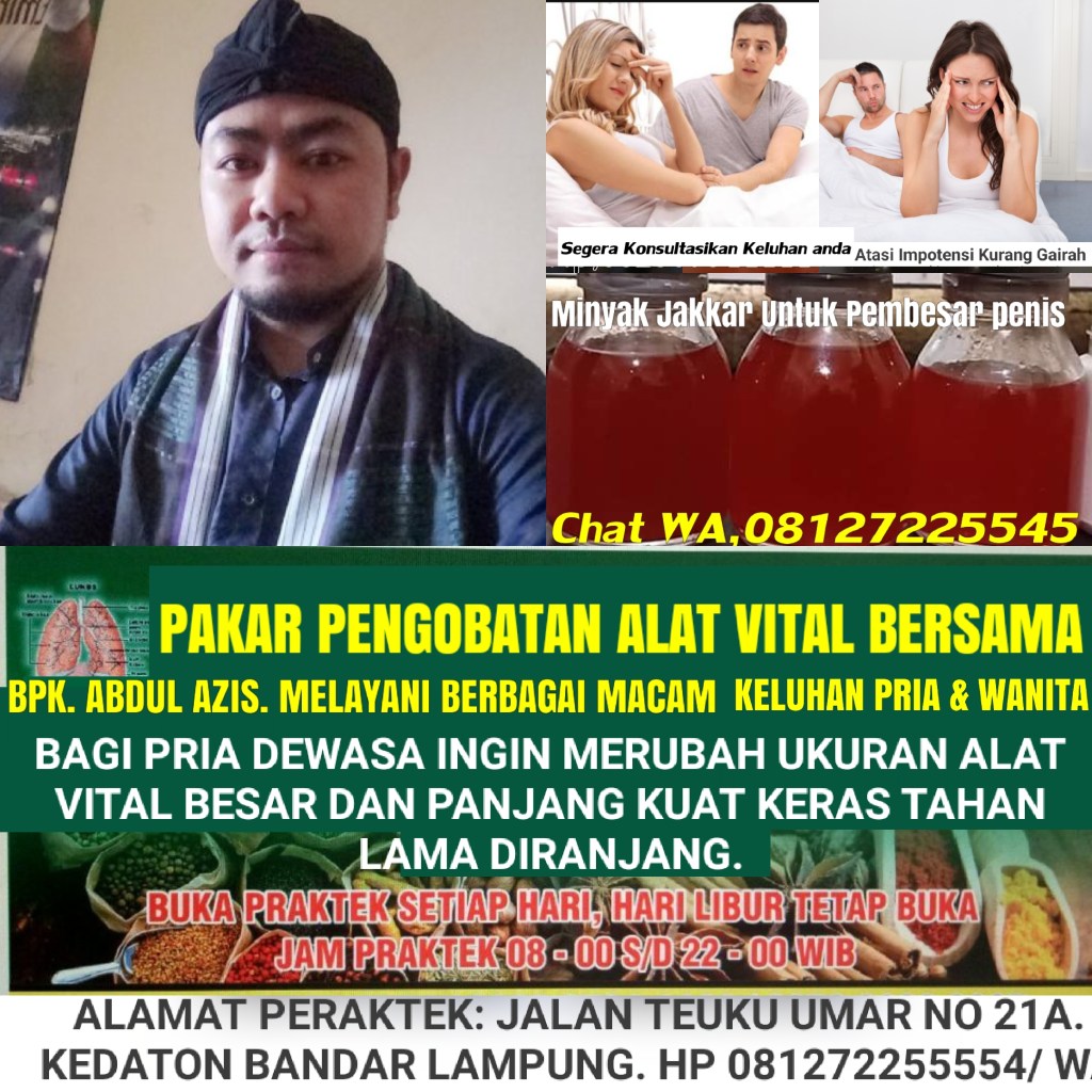 KABAR GEMBIRA HOTT BERITA UNTUK PASUTRI,,! Kini Hadir Pakar Pengobatan ALAT VITAL Bersama BPK Abdul azis, Di KEDATON BANDAR LAMPUNG, Melayani Berbagai Macam Keluhan Pria Dan Wanita, Solusi Terbaik kami Menawarkan Bpk Ibu Bagi Yang Mengalami Masalah Dengan Seputar Vitalitas Kurang Percaya Diri Karena Ukuran ALAT VITAL Anda Kecil Dan Kurang Perkasa, Dan Kami Akan Memberikan PENGOBATAN Secara Alamiah Metode Pengguna Terapi Diurut Pake Minyak Jakkar Khususnya Untuk Menambah Ukuran ALAT VITAL Besar Dan Panjang, Dan Setelah Itu Diberikan Ramuanya Untuk Menambah Setamina Durasi Ereksi Menjadikan Alat Vital Kuat Keras Tahan Lama DIRANJANG. Dan Dibantu Do’A,? Bagi Yang Punya Keluhan Langsung Konsultasikan Demi Menjaga Keutamaan Pasangan Anda Dan Anda Akan Menjadi Lebih Percaya Diri Dan HARMONIS,!! Klinik Pengobatan BPK Abdul azis Banyak Manfaat Nya.