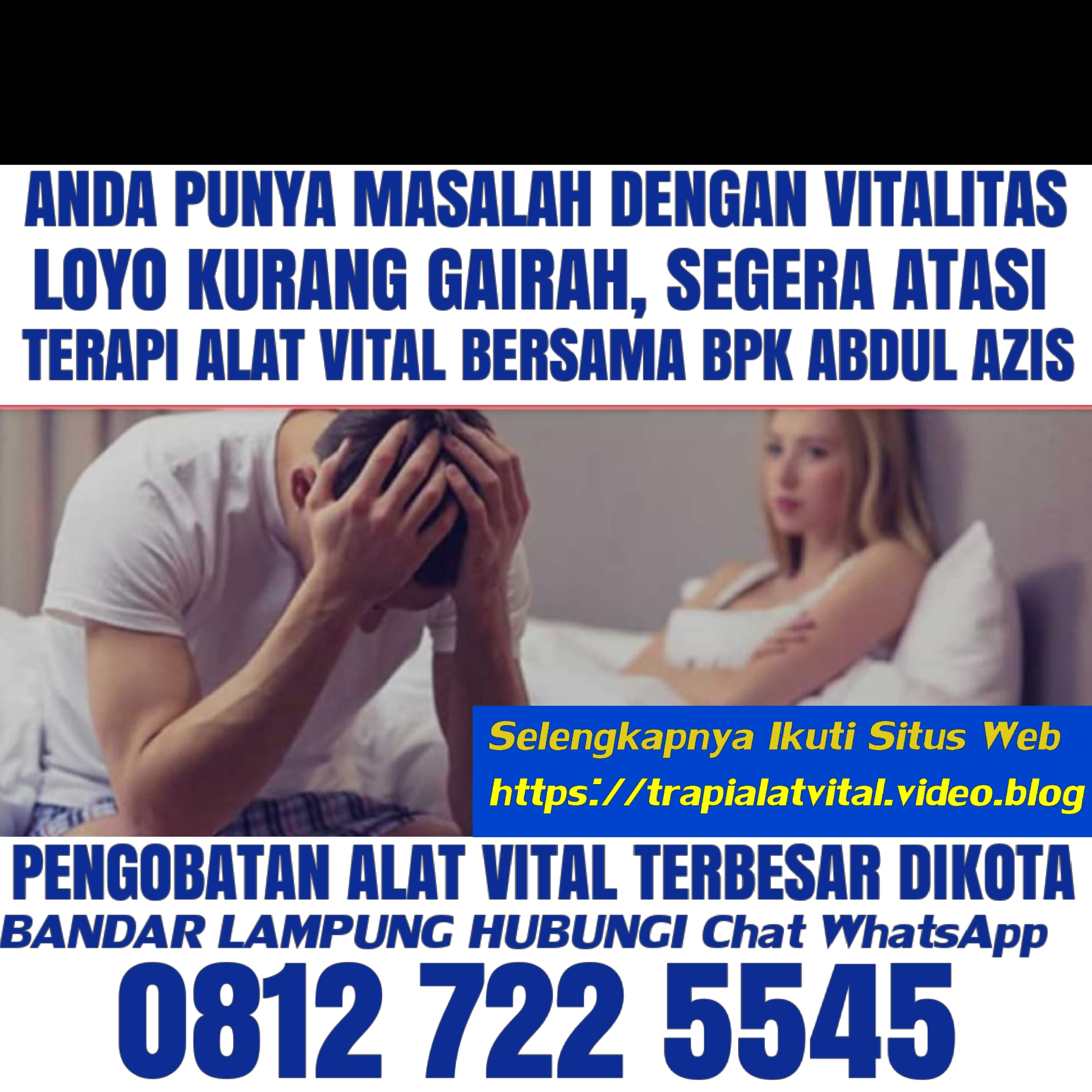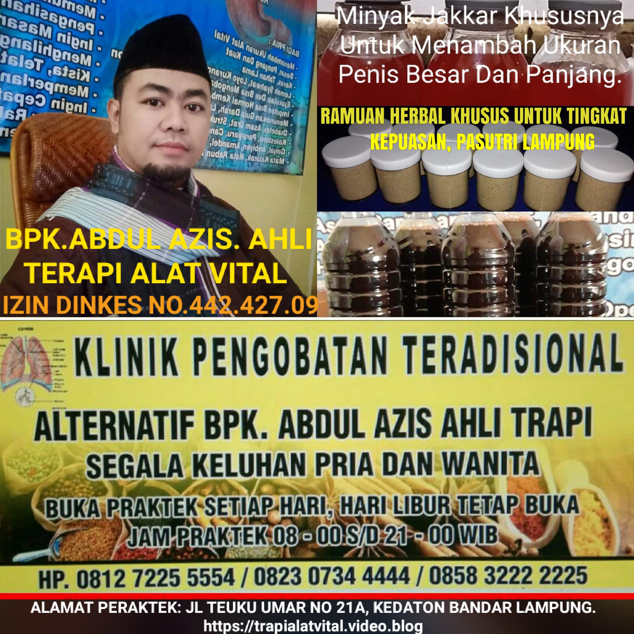 Bpk. Abdul azis. PEMILIK TEMPAT PENGOBATAN SPESIALIS VITALITAS ALTERNATIF LOKASI BERADA DI JALAN TEUKU UMAR. No 21 SAMPING PUSKESMAS KEDATON PAS FELAY OVER DEKAT MALL BUMIKEDATON Dan Gak Jauh Dari PTP 7. BANDAR LAMPUNG. INDONESIA