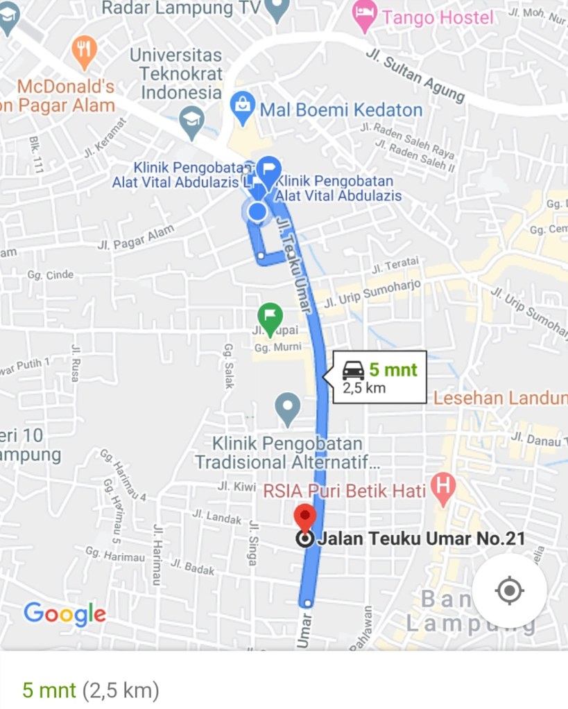 Alamat Praktek Menetap: JL Teuku Umar No 21A, Samping Puskesmas Pas Felay Over Dekat Mall Bumikedaton Kedaton Bandar Lampung.